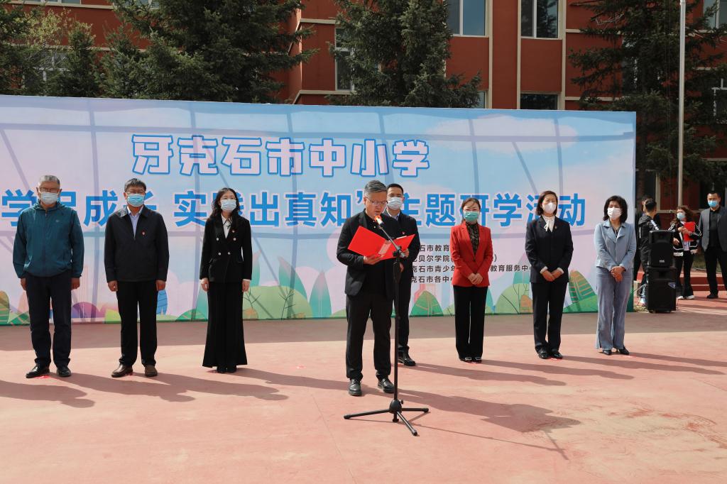 我校党委委员、副校长田振江,牙克石市委副书记、政法委书记徐向泽等相关领导参加活动仪式,并为牙克石市中小学生劳动教育实践基地揭牌。徐向泽宣布牙克石市中小学“研学促成长 实践出真知”实践主题春夏研学活动开营。